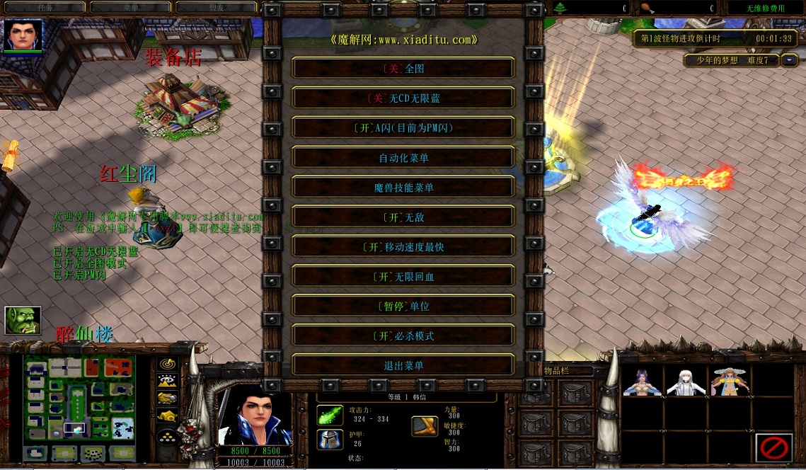 | 技能菜单【光环类技能】 | 自动化菜单【自动加钱木,提升英雄三围】 |