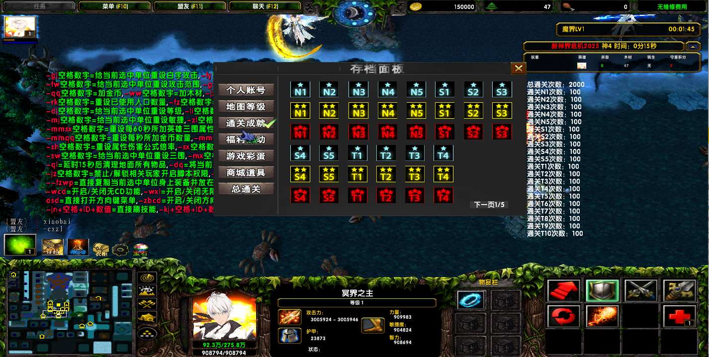 地图名字:新神界危机2025 1.0.92地图下载+全商城特权+全存档+隐藏英雄+无CD+指令功能
